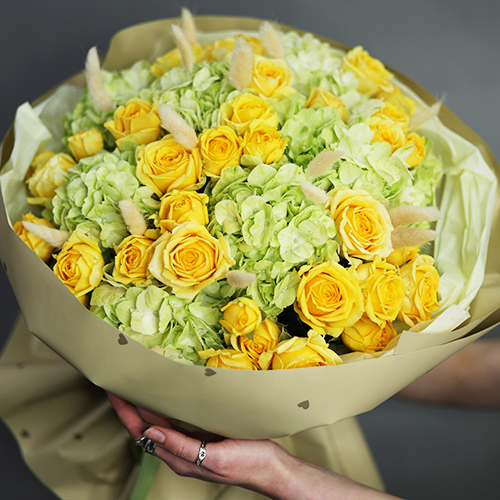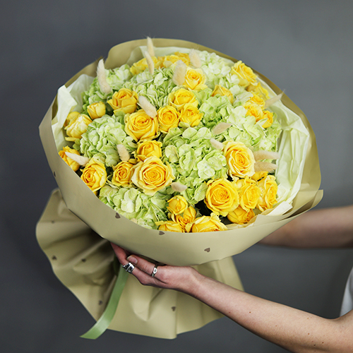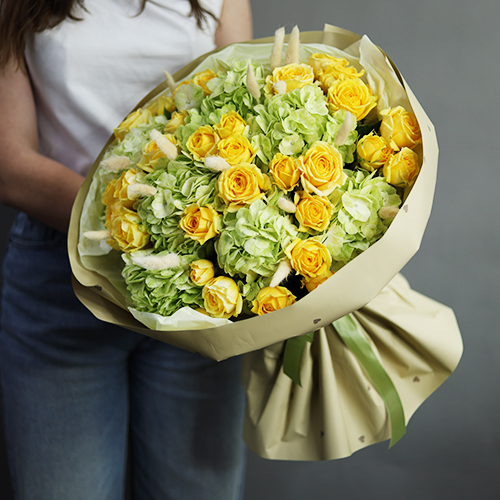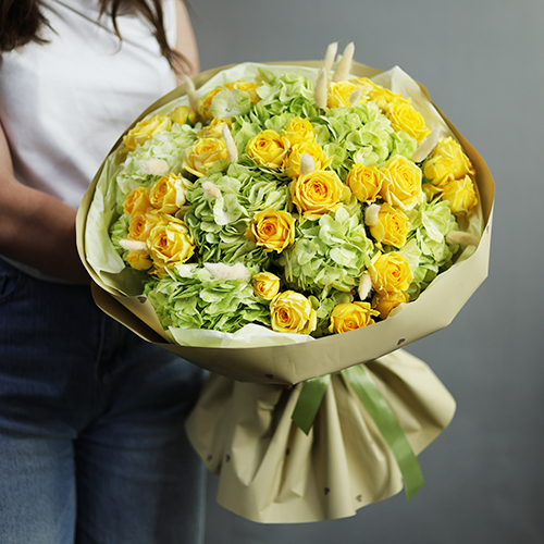 Букет "Шампань" из гортензий и пионовидных кустовых роз